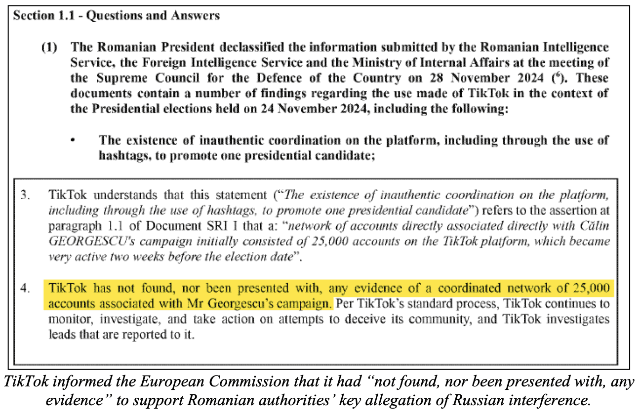Alegațiile de interferență rusă: Serviciile de informații române au susținut existența unei operațiuni rusești de influență coordonată (CIO) pe TikTok. Totuși, echipele interne ale TikTok au evaluat că nu există dovezi pentru o astfel de operațiune. Platforma a detectat doar trei CIO-uri (niciuna din Rusia; una pro-Georgescu din România, cu mai puțin de 2.000 de urmăritori). TikTok a informat repetat autoritățile române și Comisia Europeană că „nu a găsit și nici nu i s-a prezentat vreo dovadă” privind rețeaua alegată. Până la sfârșitul decembrie 2024, rapoarte media (citând autoritatea fiscală română) au dezvăluit că campania a fost finanțată de un alt partid politic român (Partidul Național Liberal, PNL, de centru-dreapta), nu de Rusia. Rapoarte publice ulterioare au pus sub semnul întrebării narațiunea rusă, fără dovezi concrete furnizate de autorități.